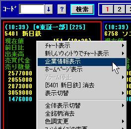 銘柄を右クリック後、ポップアップ画面で「企業情報表示」をクリックすると企業情報の画面が表示され、選択された銘柄の業績が表示されます。